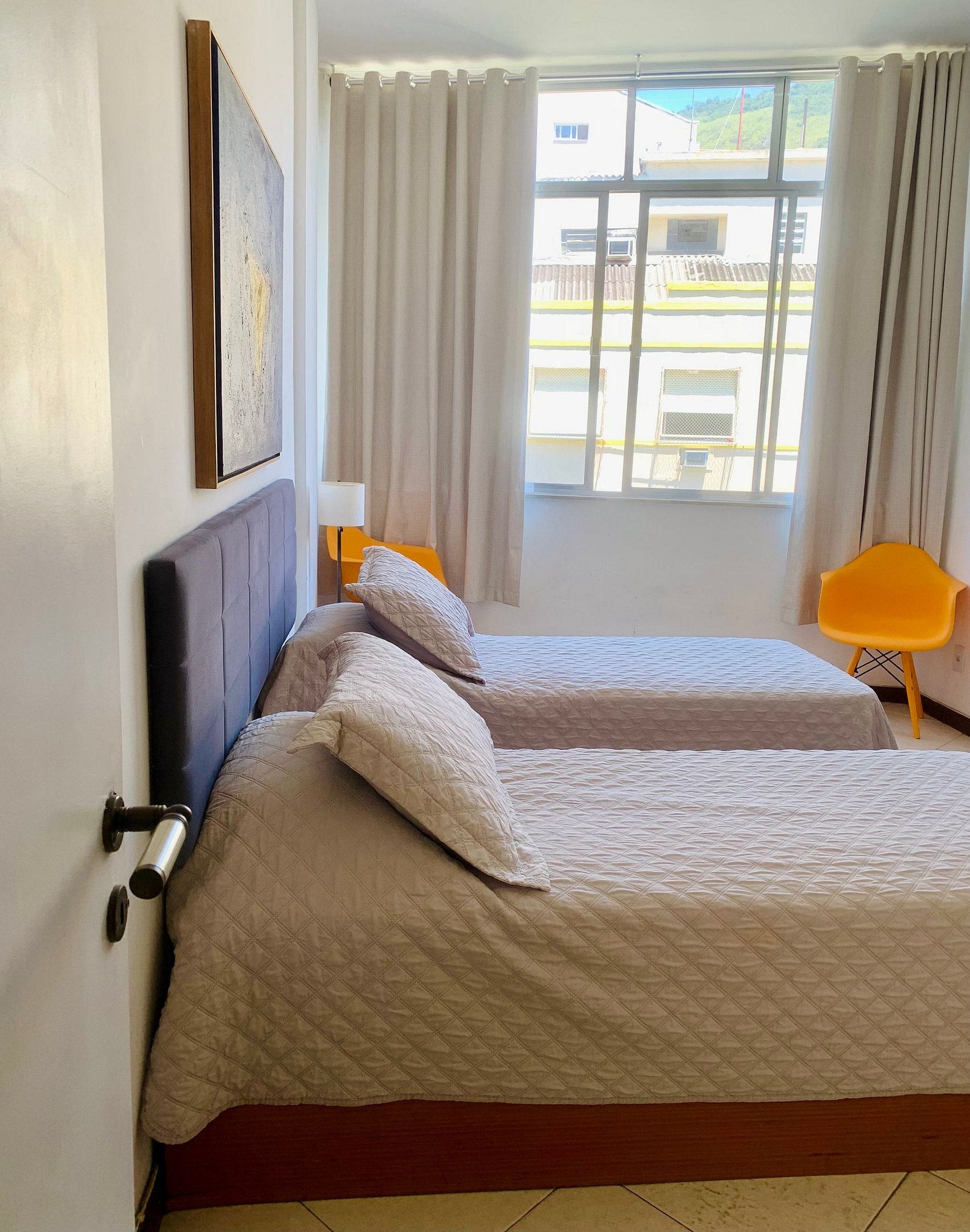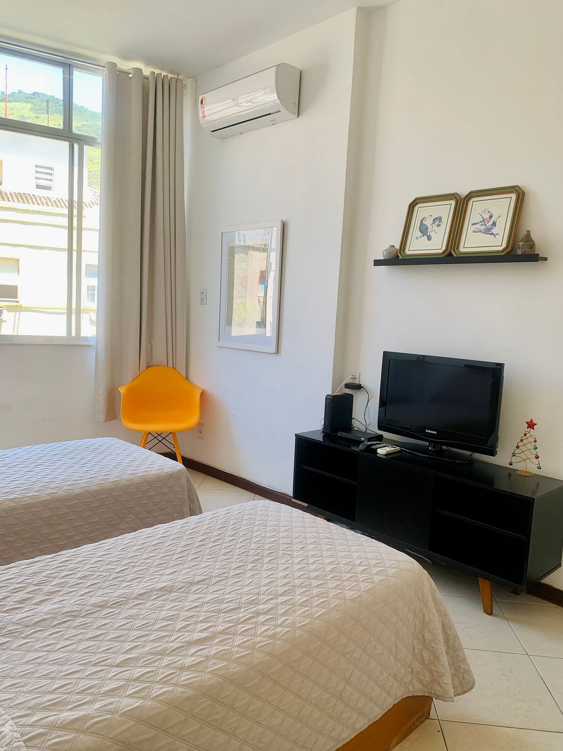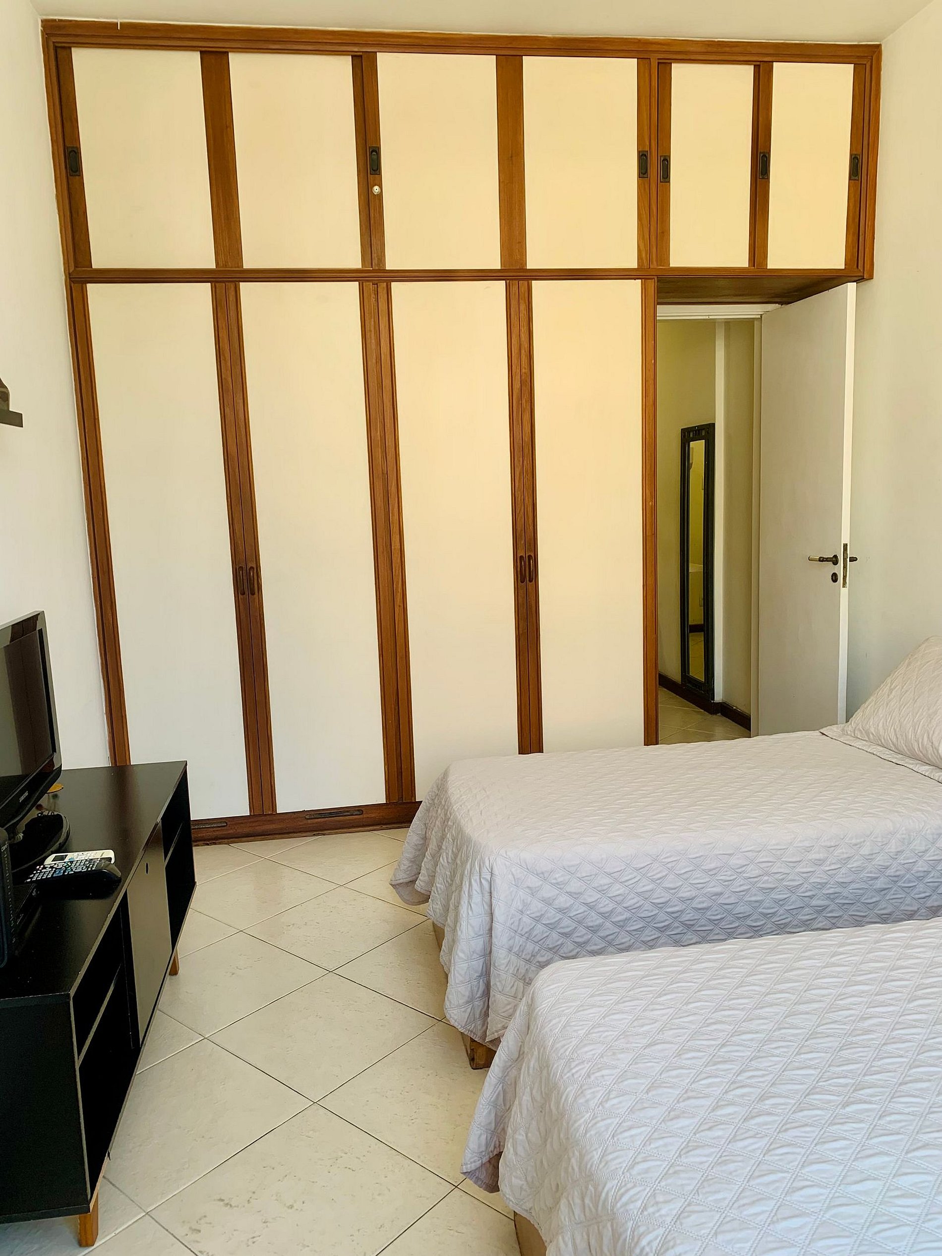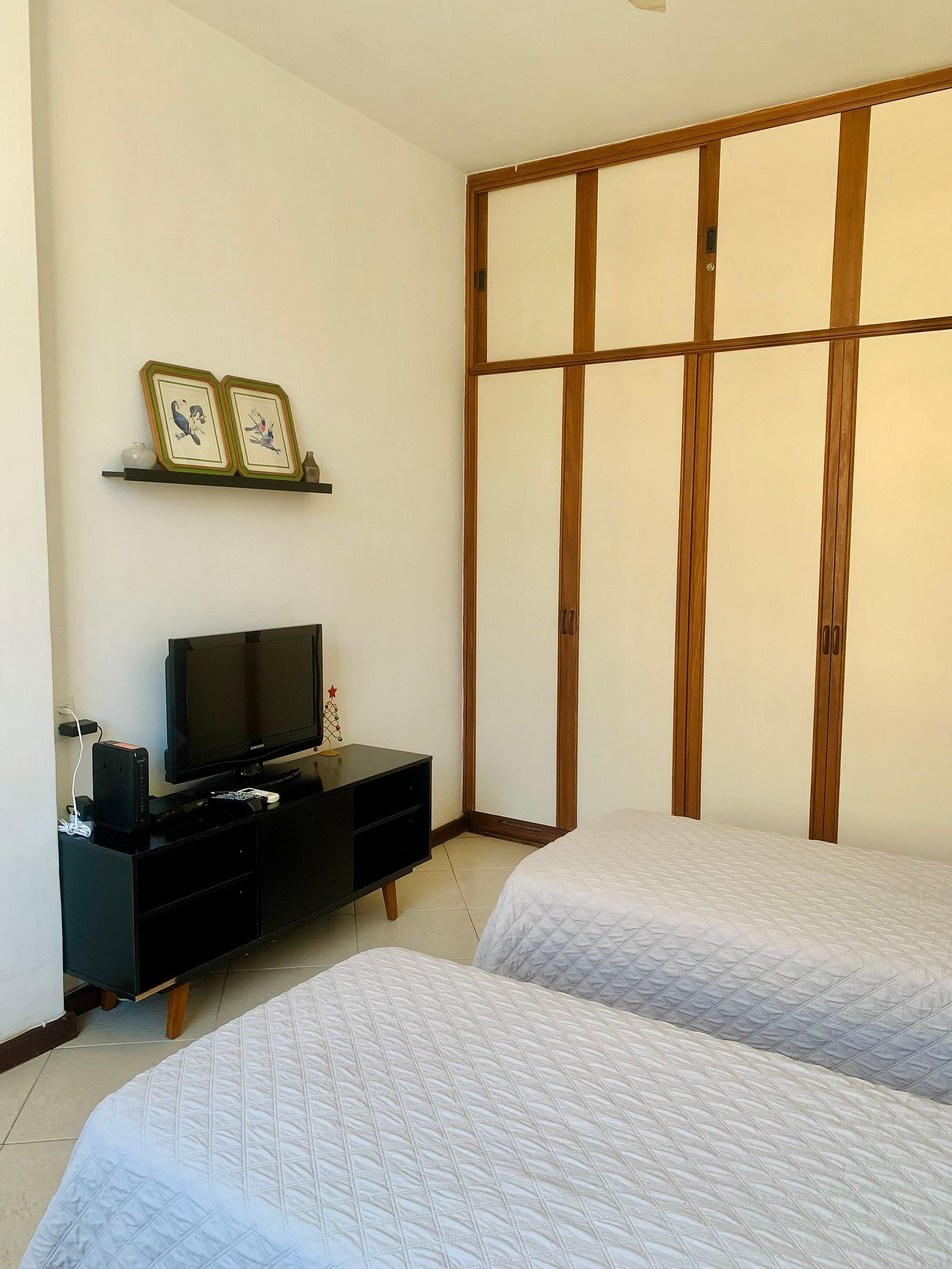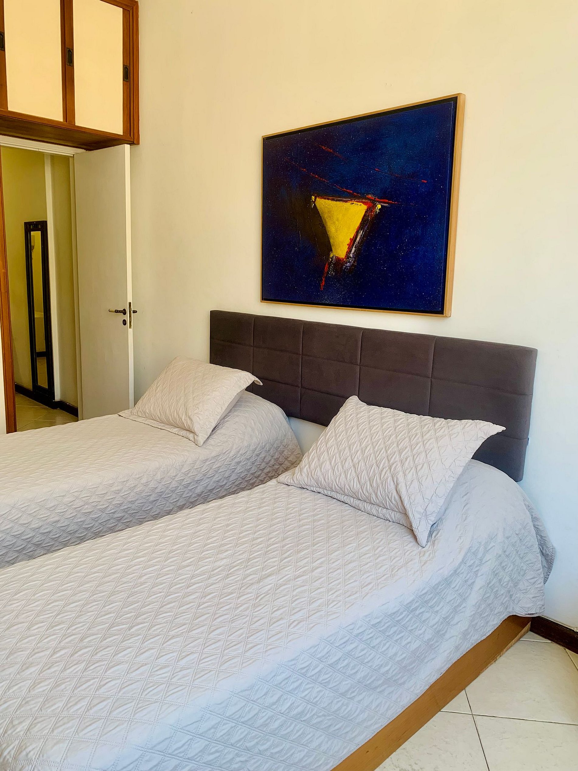 Apartamento recém reformado, amplo e arejado, piso em cerâmica, com duas camas box de solteiro e um sofá cama para 1 pessoa. As camas podem ser unidas formando uma cama casal tamanho queen.