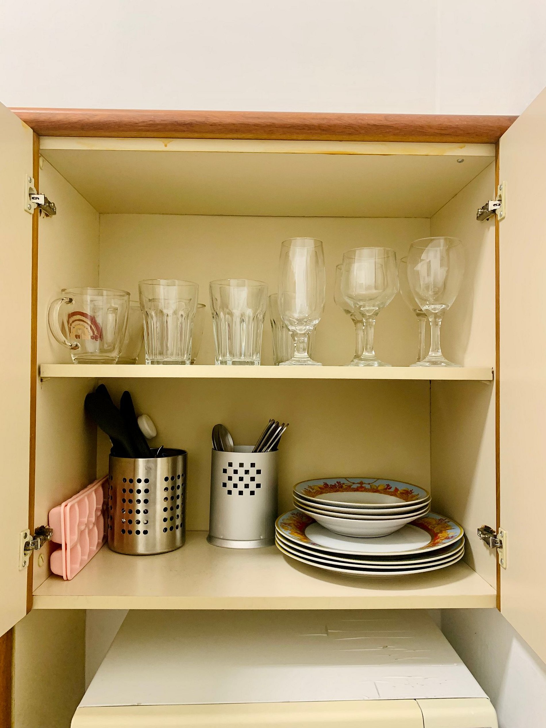 Cozinha com fogão de 2 bocas com forno, frigobar e armários. Utensílios básicos de cozinha, como panelas, pratos, talheres e copos.